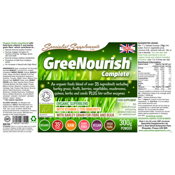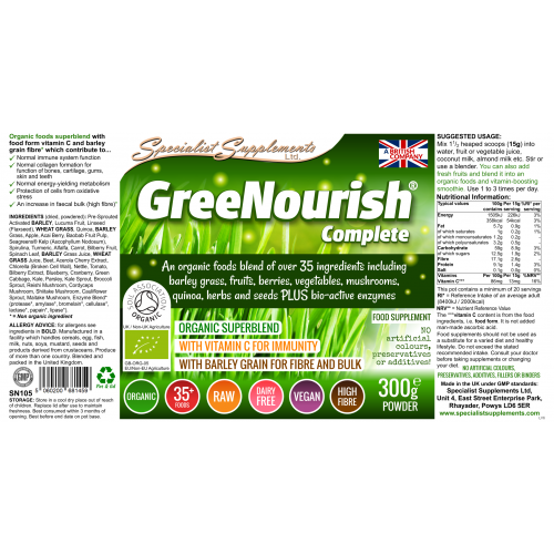 GreeNourish Complete is geen gewone groene shake ... Deze vezelrijke biologische voedingsmiddelencombinatie bevat 35 groene voedingsmiddelen, groenten, fruit, bessen, kruiden, champignons, spruiten en zaden PLUS bio-actieve enzymen in een enkele portie - organische veganistische voeding gemakkelijk gemaakt , met van nature een hoog gehalte aan vitamine C-vorm.