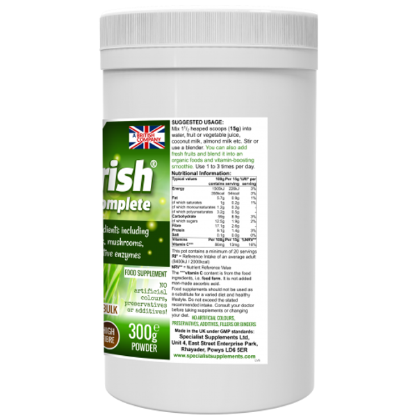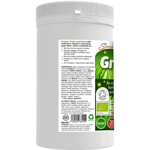 Ingrediënten: Voorgekiemde actieve gerst, appel, lijnzaad (lijnzaad), tarwegras, Quinoa, gerstgras, alfalfa, Seagreens® Kelp (Ascophyllum), Spirulina, Acai Berry, wortel, kurkuma, bosbessenfruit, spinazieblad, citroenschil, Gerstegrassap, Tarwegrassap, Biet, Acerola-kersenextract, Chlorella (gebroken celwand), Brandnetel, Tomaat, Bosbessenextract, Bosbes, Cranberry, Groene Kool, Boerenkool, Peterselie, Boerenkoolspruit, Broccolispruit, Reishi-paddestoel, Cordyceps-paddestoel , Shiitake-paddestoel, bloemkoolspruit, Maitake-paddestoel, enzymmengsel * (protease *, amylase *, bromelaïne *, cellulase *, lactase *, papaïne *, lipase *) * = niet-organisch ingrediënt.